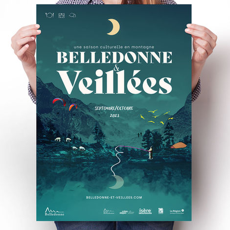 Depuis 2022, l'association Espace Belledonne me fait confiance pour la création de l'affiche de l'événement "Belledonne et Veillées". Le but de cet événement est de mettre en avant les initiatives locales et aborde des thématiques propres à la région de Belledonne. Le programme, composé d'une dizaine de rendez-vous et animations de septembre à octobre, est disponible sur le site de l'association.